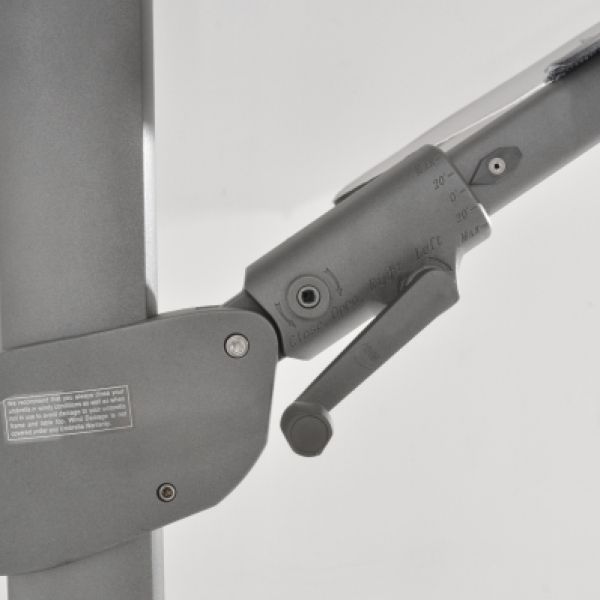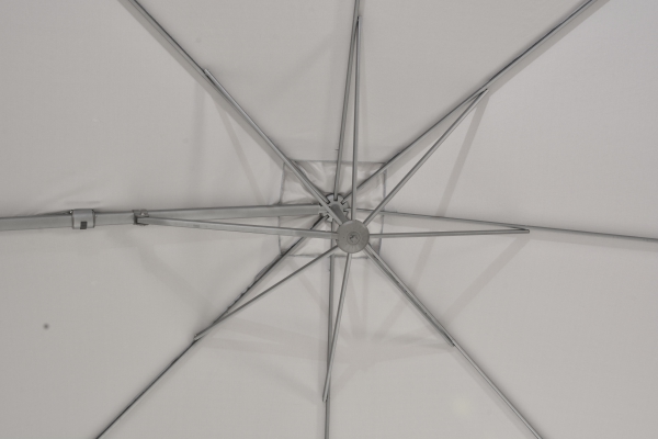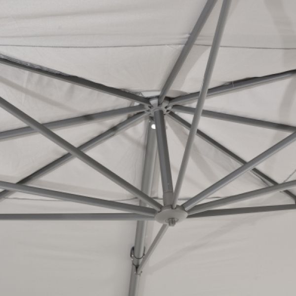 Vrijhangende zweefparasol die zowel naar achteren kan kantelen en kan roteren om zijn as. Het doek is gemaakt van duurzaam Solefin stof.