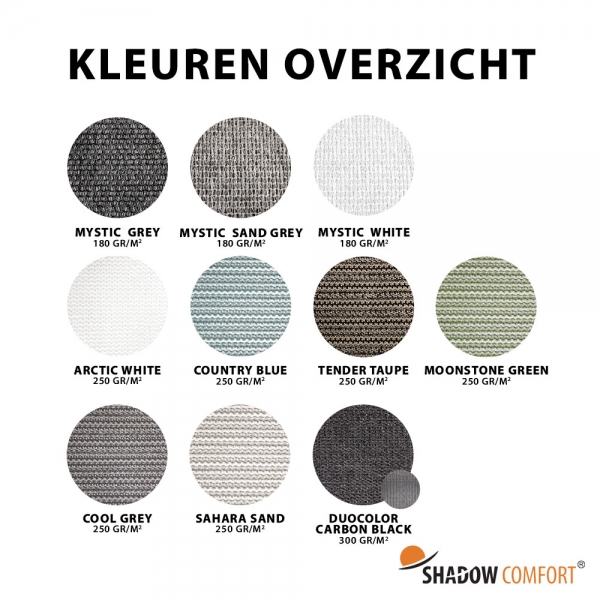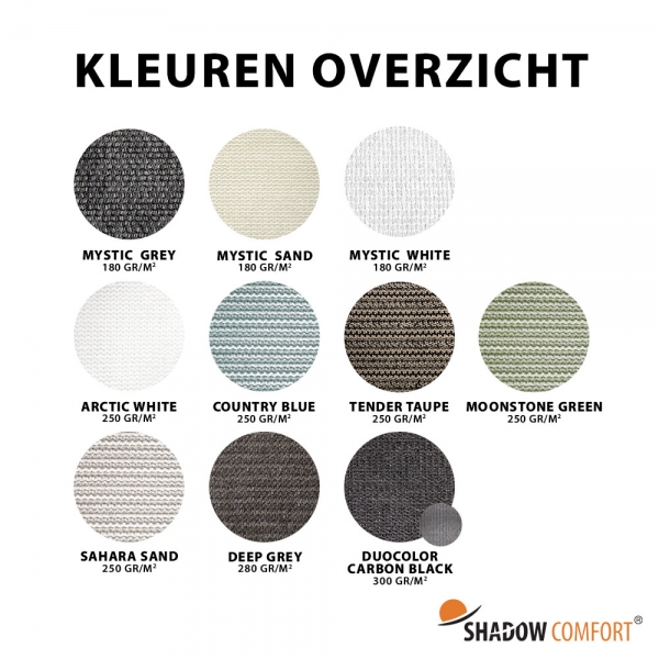 Onze Shadow Comfort schaduwdoeken zijn verkrijgbaar in verschillende uitvoeringen en kwaliteiten. Hieronder leggen we de belangrijkste verschillen voor je uit, zodat je een goede keuze kunt maken die past bij jouw wensen en situatie.