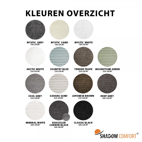 • 180 gram/m²: Mystic serie schaduwdoeken. Geschikt voor tijdelijk of licht gebruik.