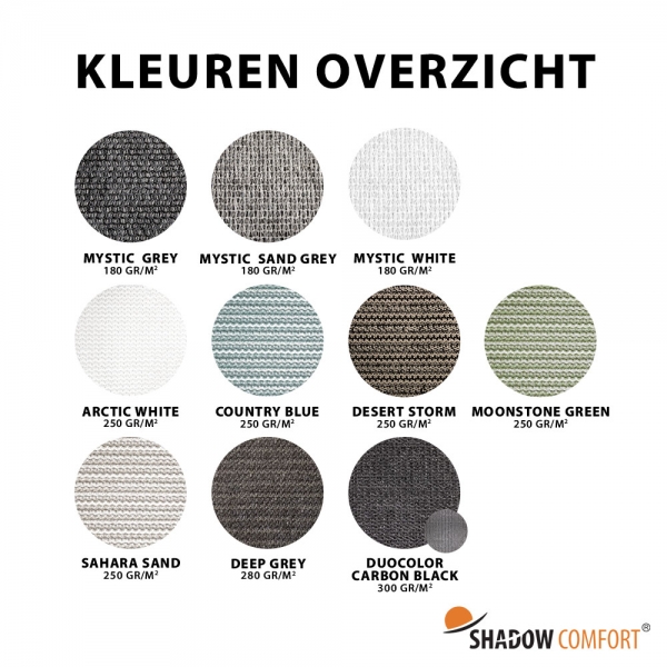 • 180 gram/m²: Mystic serie schaduwdoeken. Geschikt voor tijdelijk of licht gebruik.