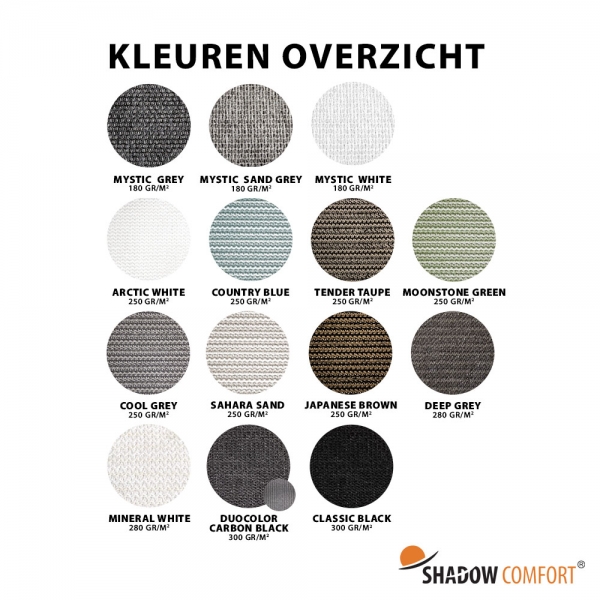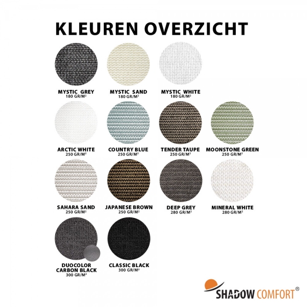 • 180 gram/m²: Mystic serie schaduwdoeken. Geschikt voor tijdelijk of licht gebruik.