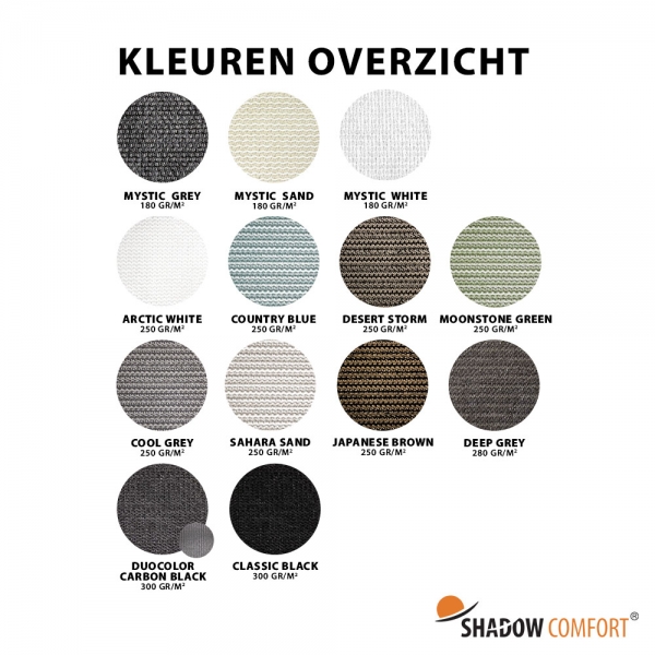 Onze Shadow Comfort schaduwdoeken zijn verkrijgbaar in verschillende uitvoeringen en kwaliteiten. Hieronder leggen we de belangrijkste verschillen voor je uit, zodat je een goede keuze kunt maken die past bij jouw wensen en situatie.