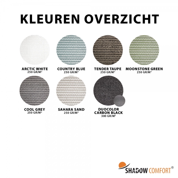 • Shadow Comfort Exclusieve schaduwdoeken (de zwaardere varianten) dienen altijd met een Shadow Comfort bevestigingsset te worden opgehangen. Alleen zo wordt de spanning goed verdeeld en voorkom je schade of doorhangen.