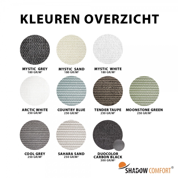 Onze Shadow Comfort schaduwdoeken zijn verkrijgbaar in verschillende uitvoeringen en kwaliteiten. Hieronder leggen we de belangrijkste verschillen voor je uit, zodat je een goede keuze kunt maken die past bij jouw wensen en situatie.