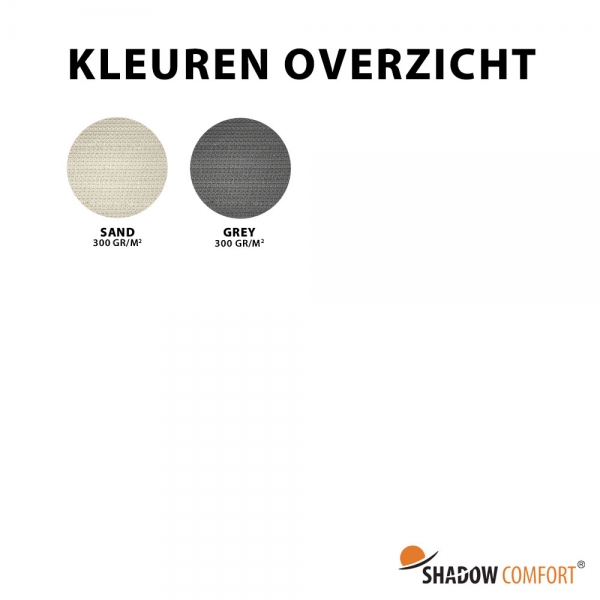 De Shadow Comfort kleur Desert storm geeft het doek een stoere of juist luxueuze sfeer. Dit doek is geweven met zandkleurige en zwarte tapefilament draden. Doordat dit zandkleurige doek geweven is met een zwarte draad is het minder besmettelijk en resulteert het in een hoger schaduwpercentage van maar liefst 95%. Door de weving van het doek heeft het een windreductie van 90% en is deze uitermate geschikt indien je meer privacy wenst. Gewicht 250 gr/m2 en UV stabilisatie 1000Kly.