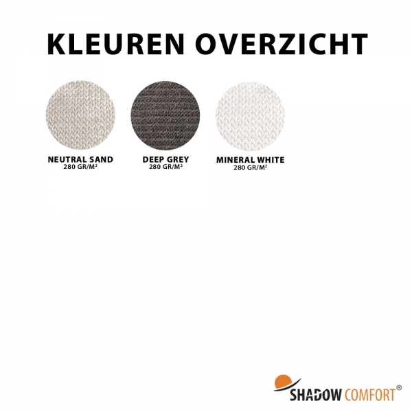 De Shadow Comfort kleur Tender Taupe geeft het doek een stoere of juist luxueuze sfeer. Dit doek is geweven met zandkleurige en zwarte tapefilament draden. Doordat dit zandkleurige doek geweven is met een zwarte draad is het minder besmettelijk en resulteert het in een hoger schaduwpercentage van maar liefst 95%. Door de weving van het doek heeft het een windreductie van 90% en is deze uitermate geschikt indien je meer privacy wenst. Gewicht 250 gr/m2 en UV stabilisatie 1000Kly.