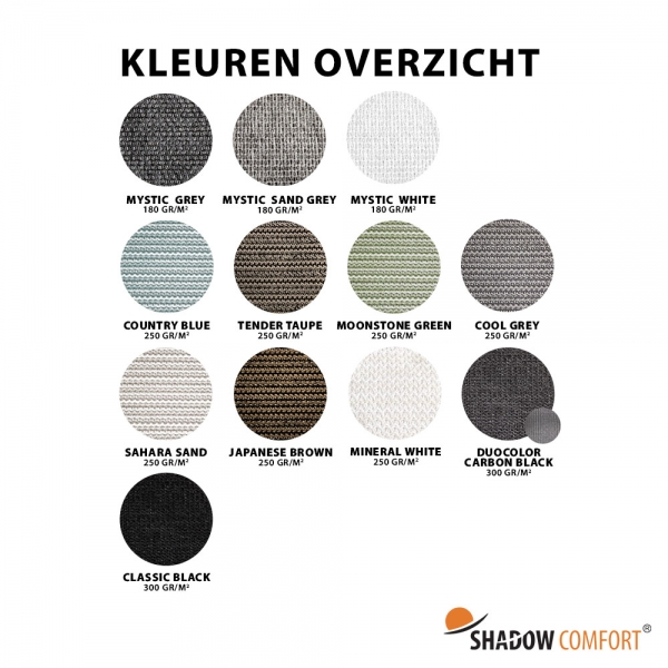 • Shadow Comfort Exclusieve schaduwdoeken (de zwaardere varianten) dienen altijd met een Shadow Comfort bevestigingsset te worden opgehangen. Alleen zo wordt de spanning goed verdeeld en voorkom je schade of doorhangen.