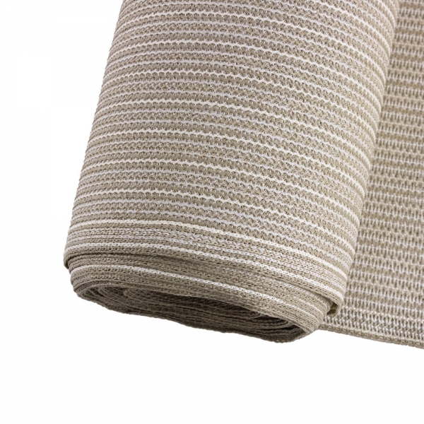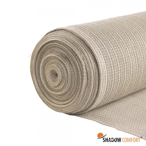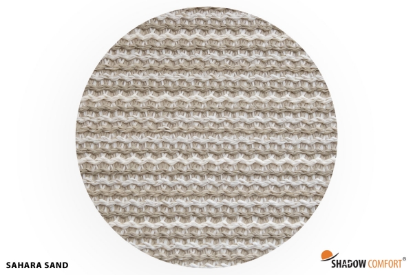 Een zeer populaire kleur is de kleur Sahara Sand, een licht naturel/zandkleurige tint geweven in combinatie met een creme kleurige draad. Deze sfeervolle kleur kan goed gecombineerd worden met vele andere tinten. Door de speciale weving van tapefilament draden is dit doek ook iets zichtdichter. Het doek heeft een gewicht van 250 gr/m2, windreductie van 90% en een schaduwpercentage van maar liefst 86%. Randafwerking boven en onderzijde met knoopsgaten.