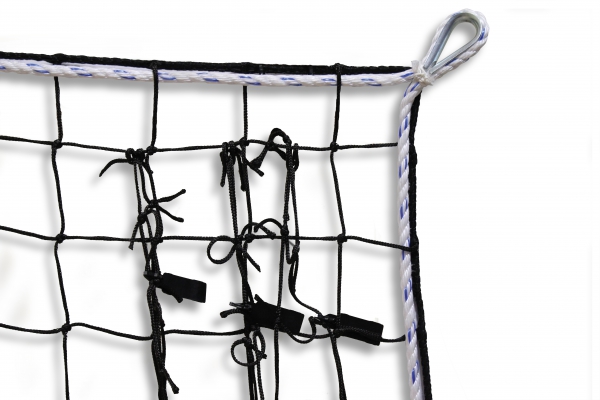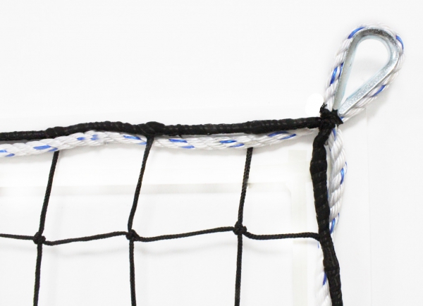 Nylon geknoopt vangnet EN 1263-1, klasse A2, type S, maas 100x100 mm., Randlijn 30 kN", draaddikte ø 4,5 mm, gegalvaniseerde hoeklussen op iedere hoek, kleur: zwart 7,50 x 15,00 meter |